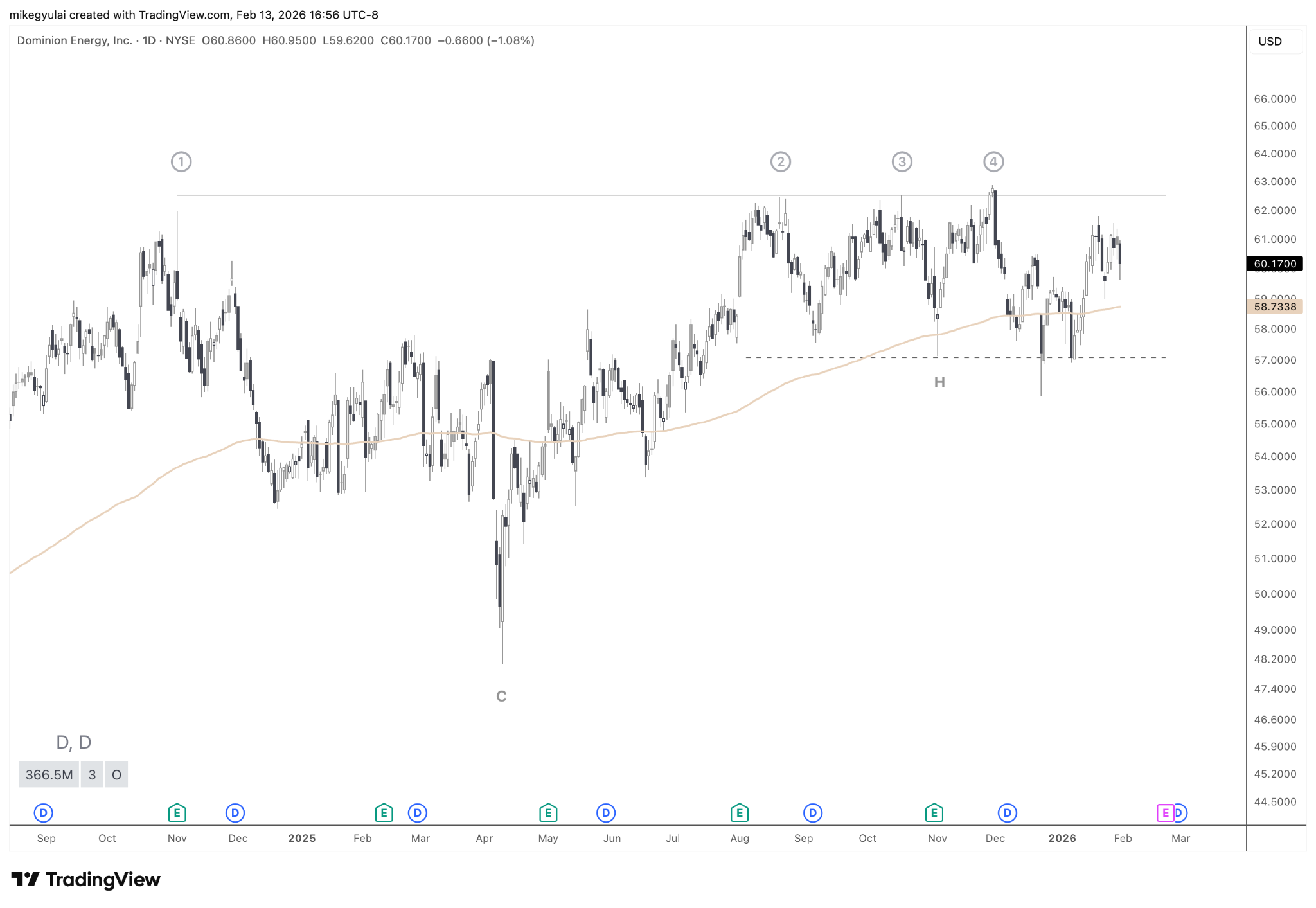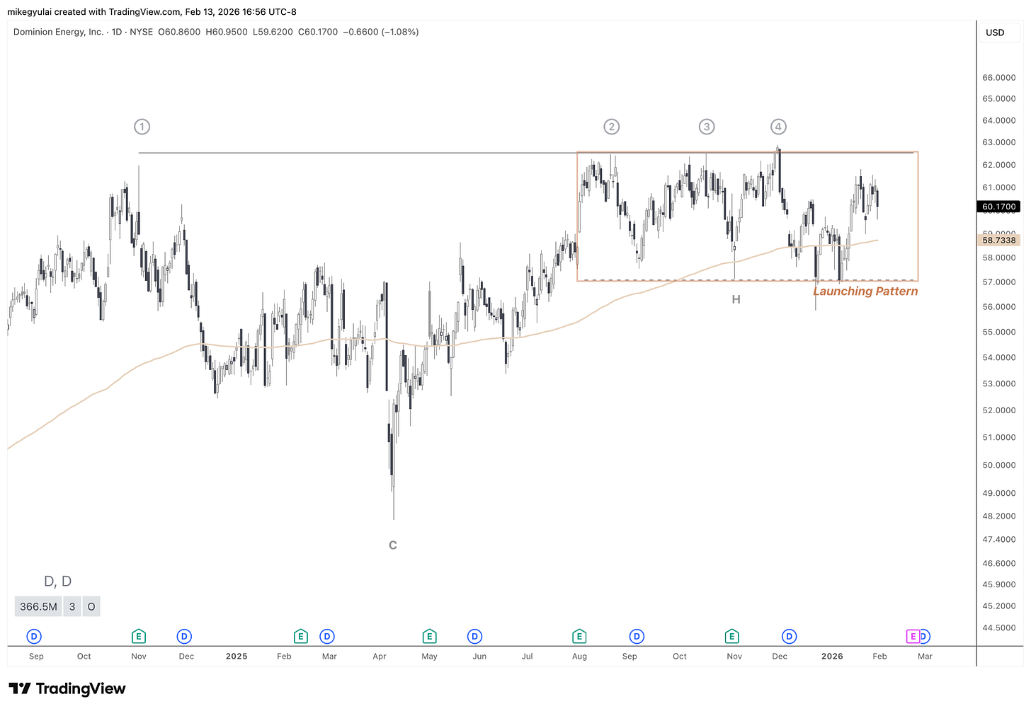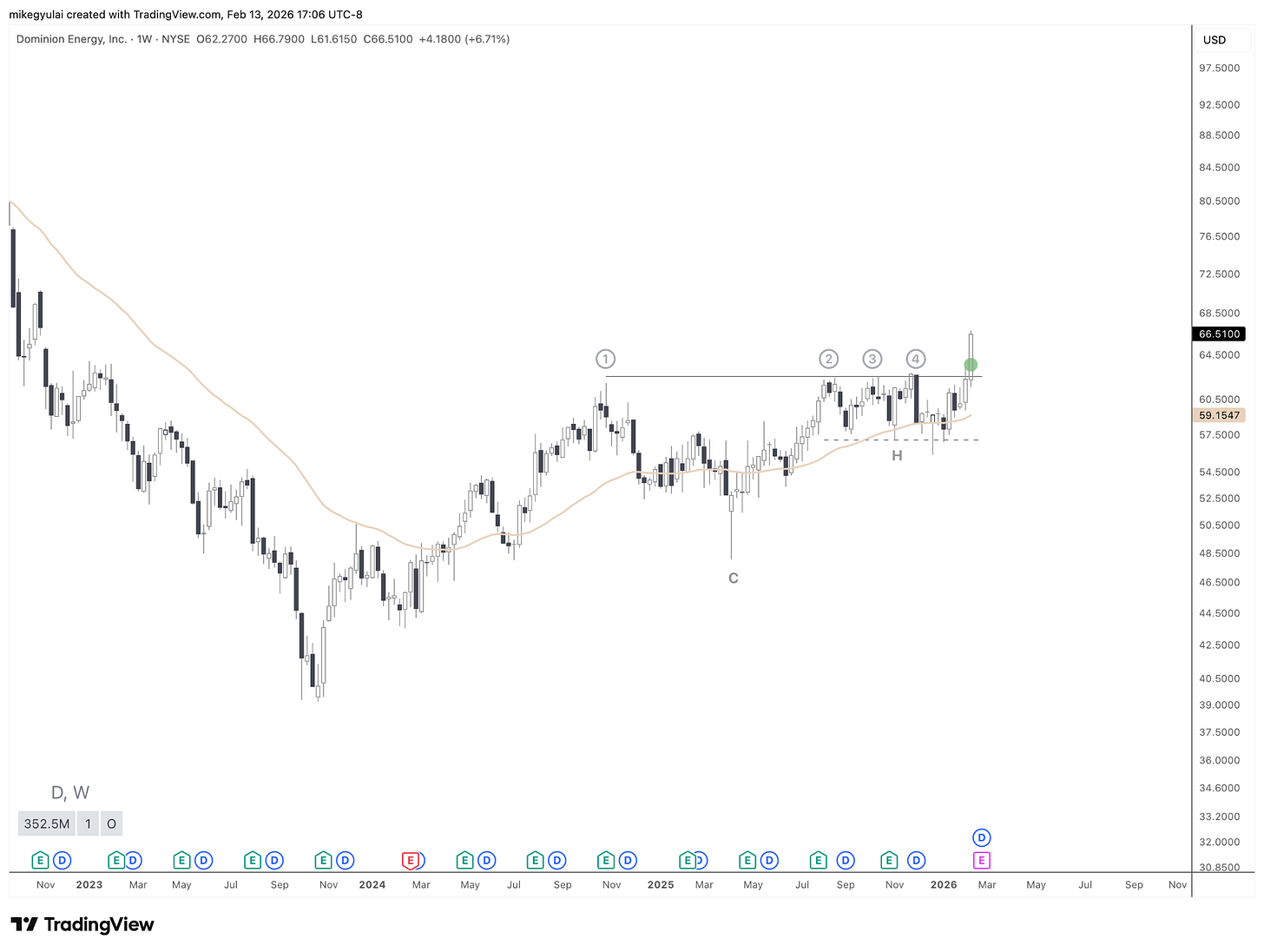 Dominion Energy has been on my watchlist since late last year. It fit every criteria I look for in my breakout setups: 1) a continuation pattern, 2) multiple months in duration, 3) directionally supported by a long-term trend filter, 4) with three or more reactions to a clearly defined price level.