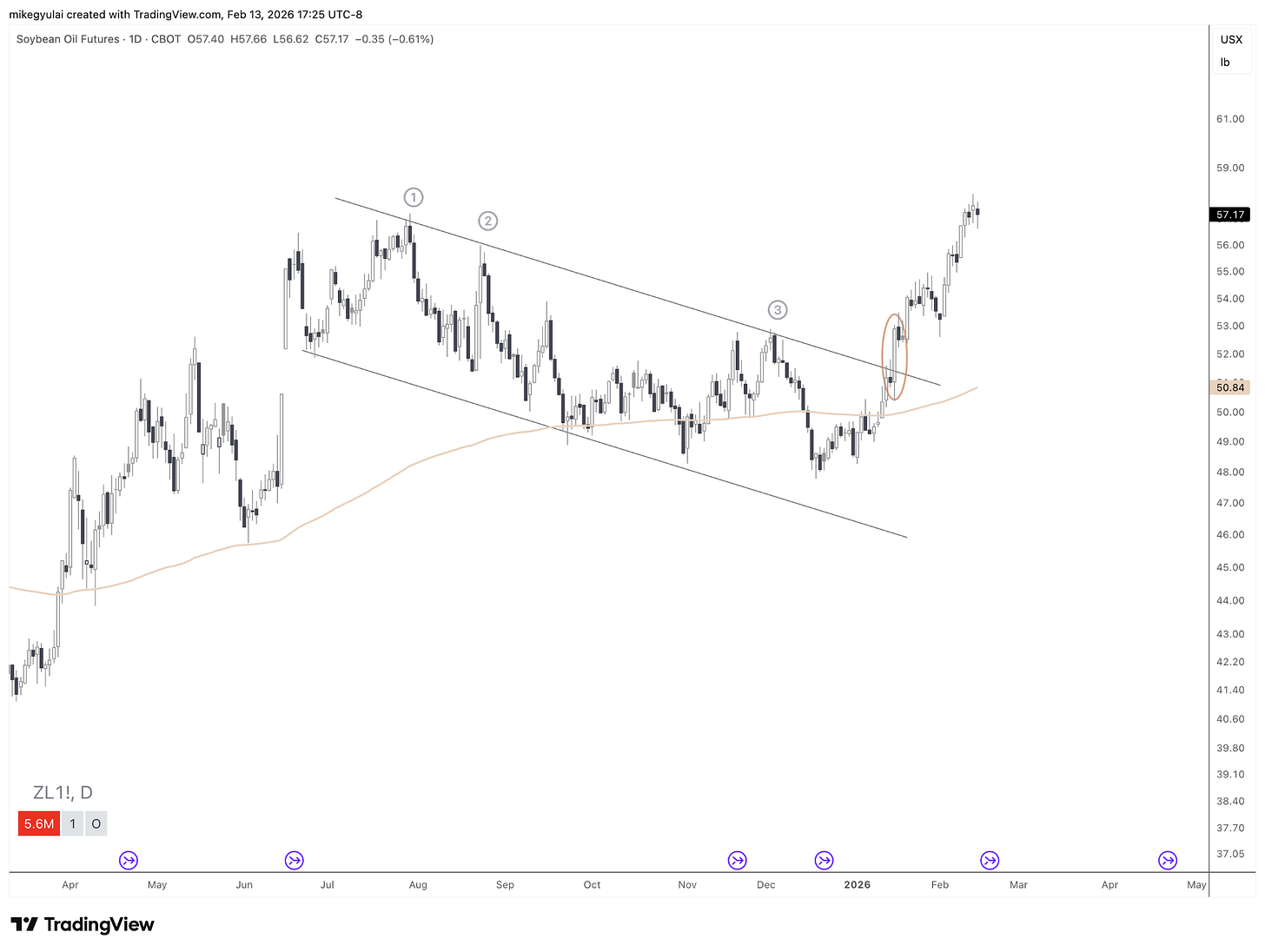 For an analog of how such channel breaks can play out, see Soybean Oil Futures: